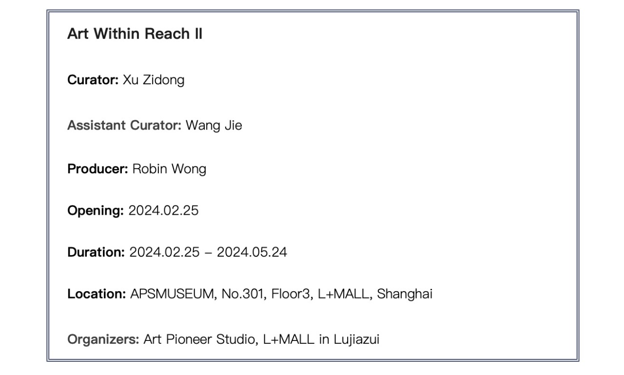 APSMUSEUM is honored to announce that the new exhibition Art Within Reach II will be opened to the public on February 25, 2024, as the next phase of the Art Within Reach series. Co-hosted by Art Pioneer Studio and L+MALL in Lujiazui and produced by Robin Wong, the exhibition invites Xu Zidong as the curator.