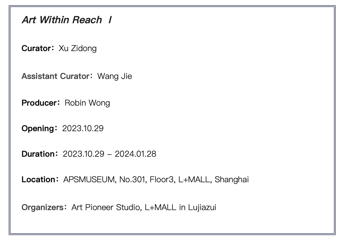 The new exhibition of APSMUSEUM, "Art Within Reach", co-hosted by Art Pioneer Studio and L+Mall Shanghai, officially opened on October 29th 2023. Produced by Robin Wong, the exhibition invites Xu Zidong as the curator, hoping to fuse contemporary art into the ordinary life with Chinese modern style.