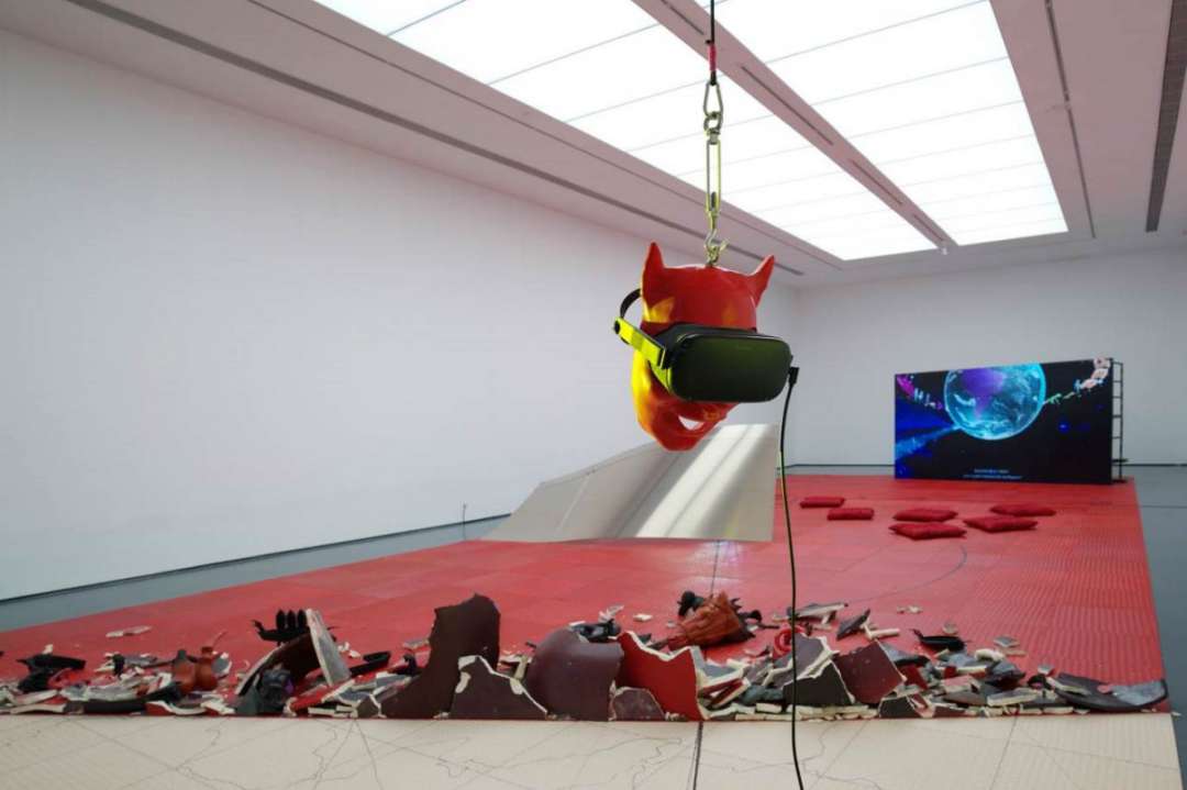 16 Splice screen animation, VR headset game, aluminum plate, projector, floor mat + map, sculpture