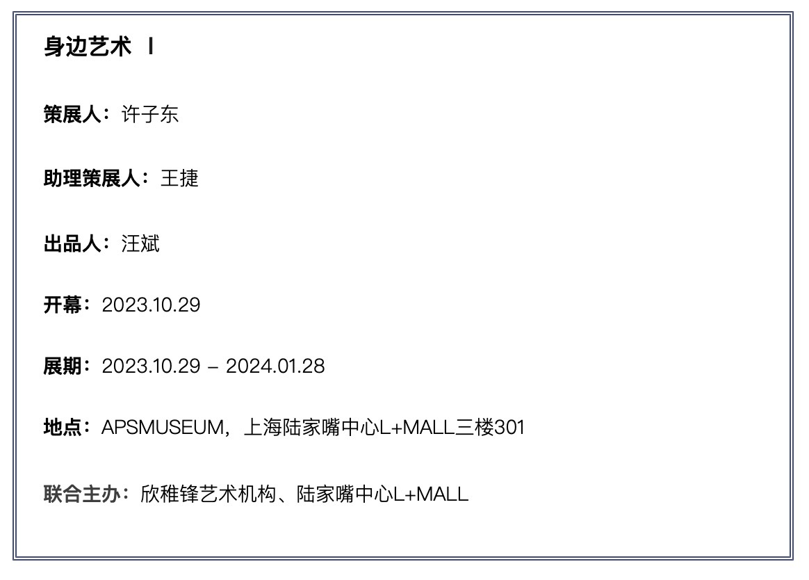 2023年10月29日,“身边艺术”系列展在APSMUSEUM盛大开幕。展览由欣稚锋艺术机构和陆家嘴中心L+MALL联合主办,汪斌担任出品人,邀请著名学者许子东教授担任策展人。此次系列展有意推出“身边艺术”主题,期望当代艺术能够进一步融入中国式现代化的日常生活。