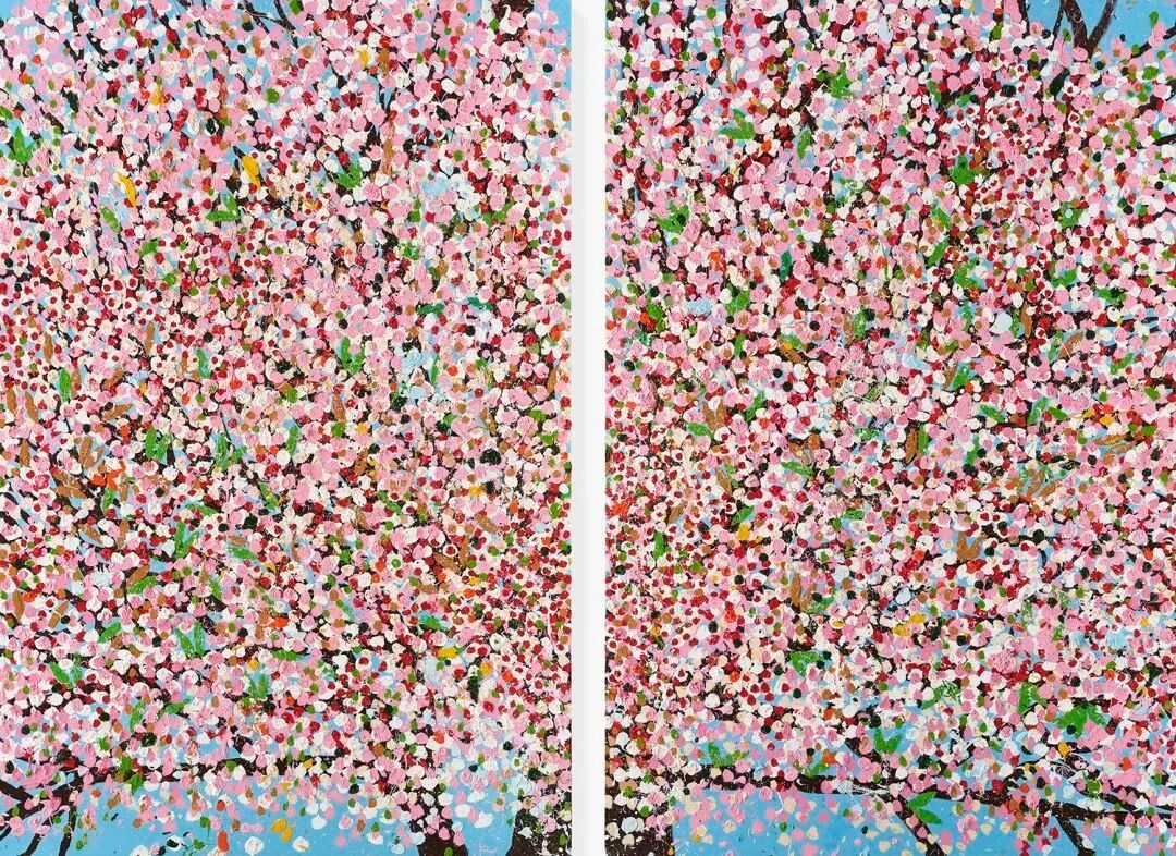 赫斯特近期的绘画“盛樱”系列以俏皮的讽刺手法重新诠释了传统风景画的主题。他既结合了厚重的笔触和姿态绘画中的元素,同时也参考了印象派、点彩派以及行动绘画的风格与影响。这些巨大的画布完全被密集的鲜艳色彩所覆盖,将观众笼罩在一个巨大的花卉景观中,在具象与抽象之间游走。盛樱系列既是一种对十九世纪末和二十世纪伟大艺术运动的颠覆,也是对它们的致敬。它们是赫斯特长期以来绘画探索中重要的一环。