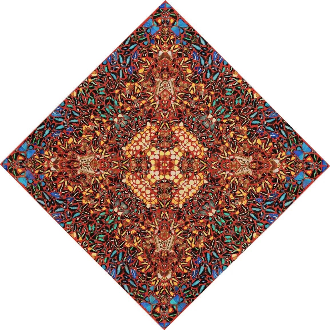 赫斯特的绘画作品同样知名当世,例如将蝴蝶悬挂在厚厚光泽涂料中的系列作品,以及将数千只蝴蝶翅膀排列成对称而美观的曼陀罗图案的“万花筒”系列。《全知》创作于2007年,是“万花筒”系列的代表作。赫斯特在此作中带给我们一片万花筒般的缤纷视野,数以百计的蝴蝶翅膀经过一丝不苟的布局,背景是热烈的鲜红色光泽涂料。这是一幅极富动感的作品,蝴蝶的翅膀仿佛形成了一个漩涡,在观者眼前转动。